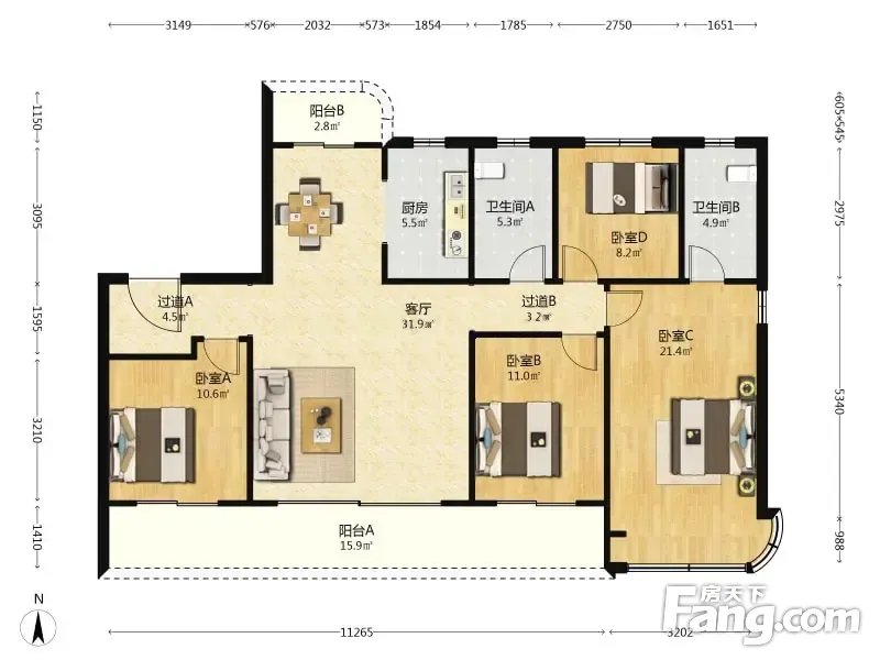 户型齐全,主打南北通透,客厅朝南四居