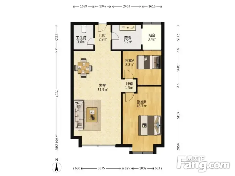 户型齐全,主打明厨,客厅朝南,主卧朝南二居