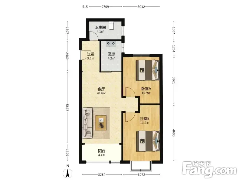 户型齐全,主打南北通透,户型方正,客厅朝南,主卧朝南二居