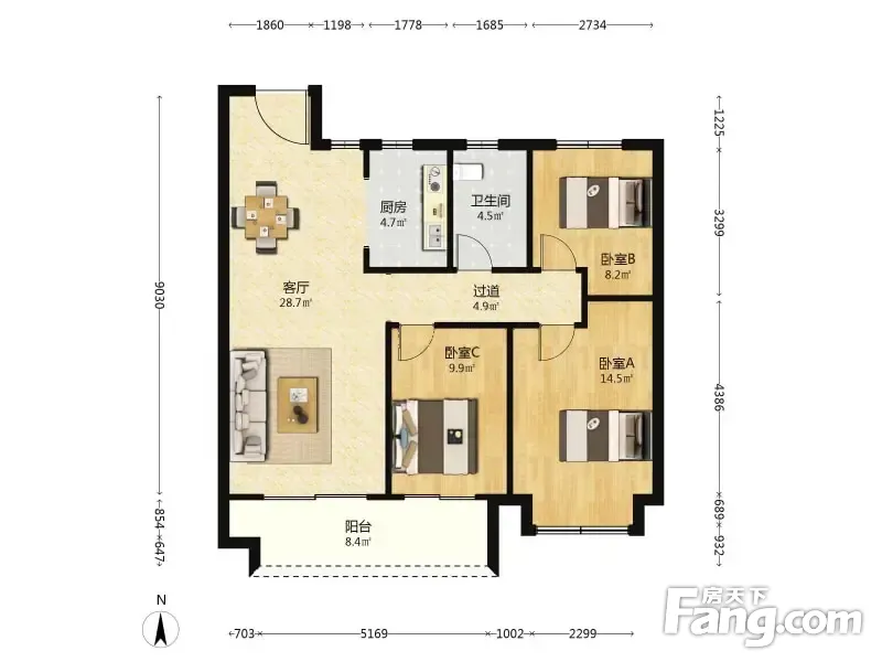 户型齐全,主打南北通透,客厅朝南四居