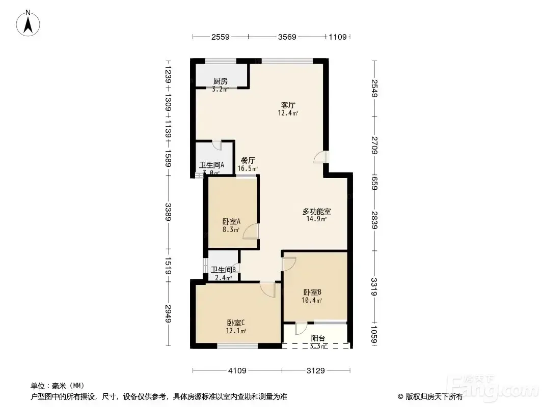 户型齐全,主打户型方正,明卫,明厨,客厅朝南,主卧朝南三居
