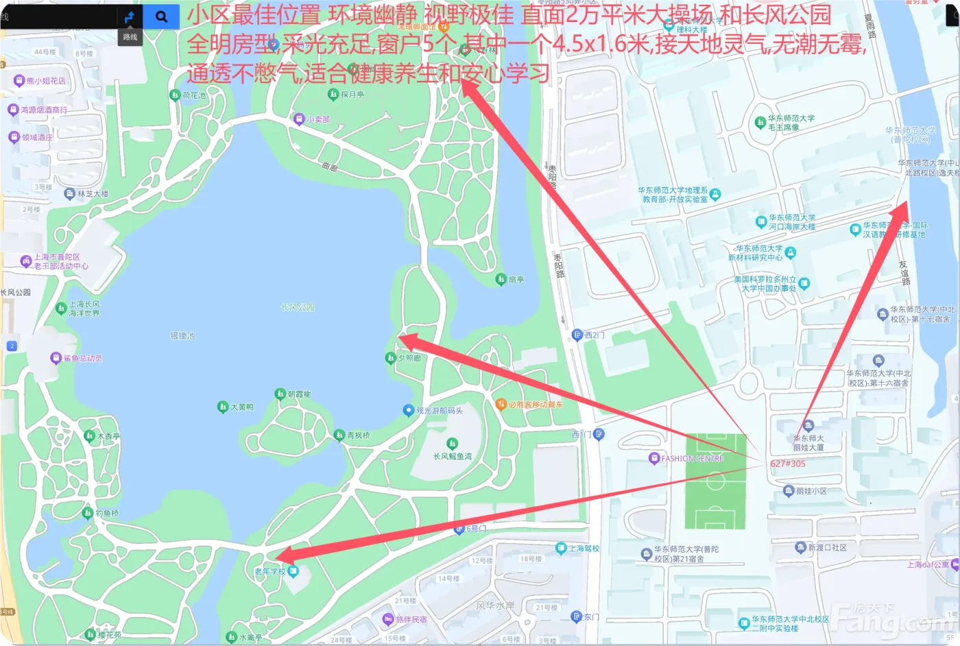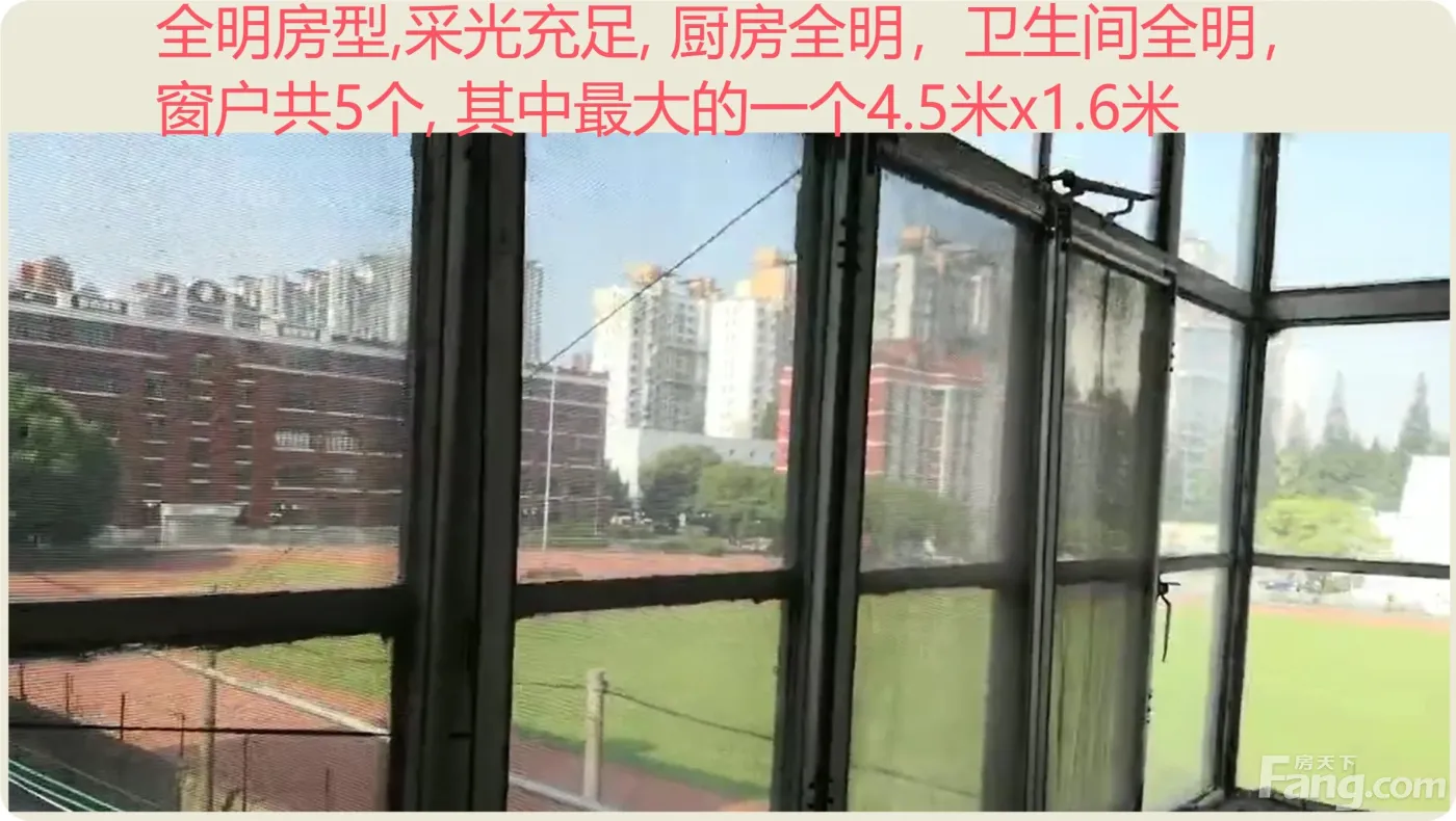 小区1号户型没有之二 视野开阔甚佳 直面2万平米大操场 和长风公园 南向全明边套,采光充足,窗户5个,其中一窗4.5x1.6米,无潮无霉,通透不憋气, 享受公园华师大校内好环境 无地铁和马路噪声 宁静安详适合健康养生和学习