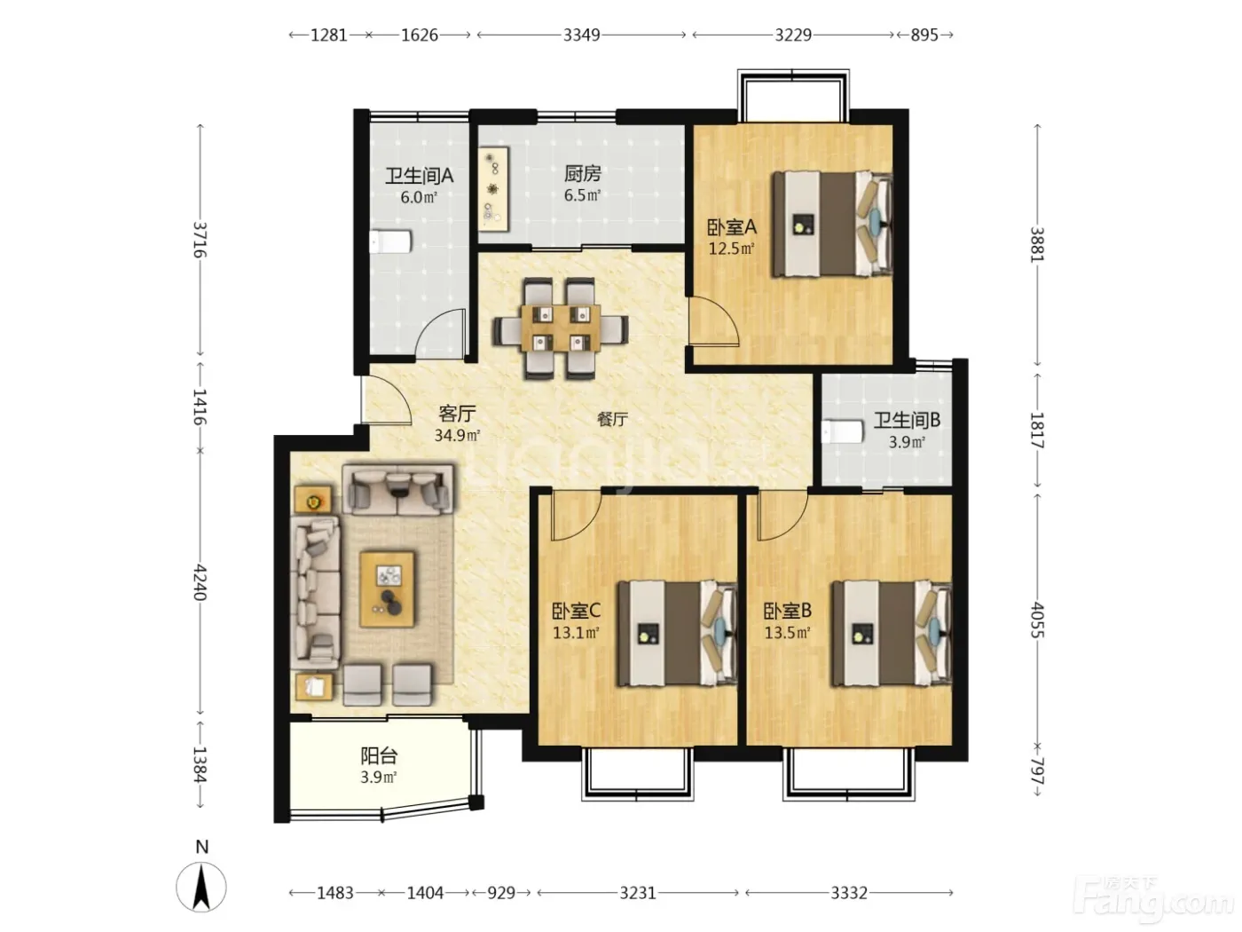 户型齐全,主打户型方正,明卫,明厨,主卧朝南三居
