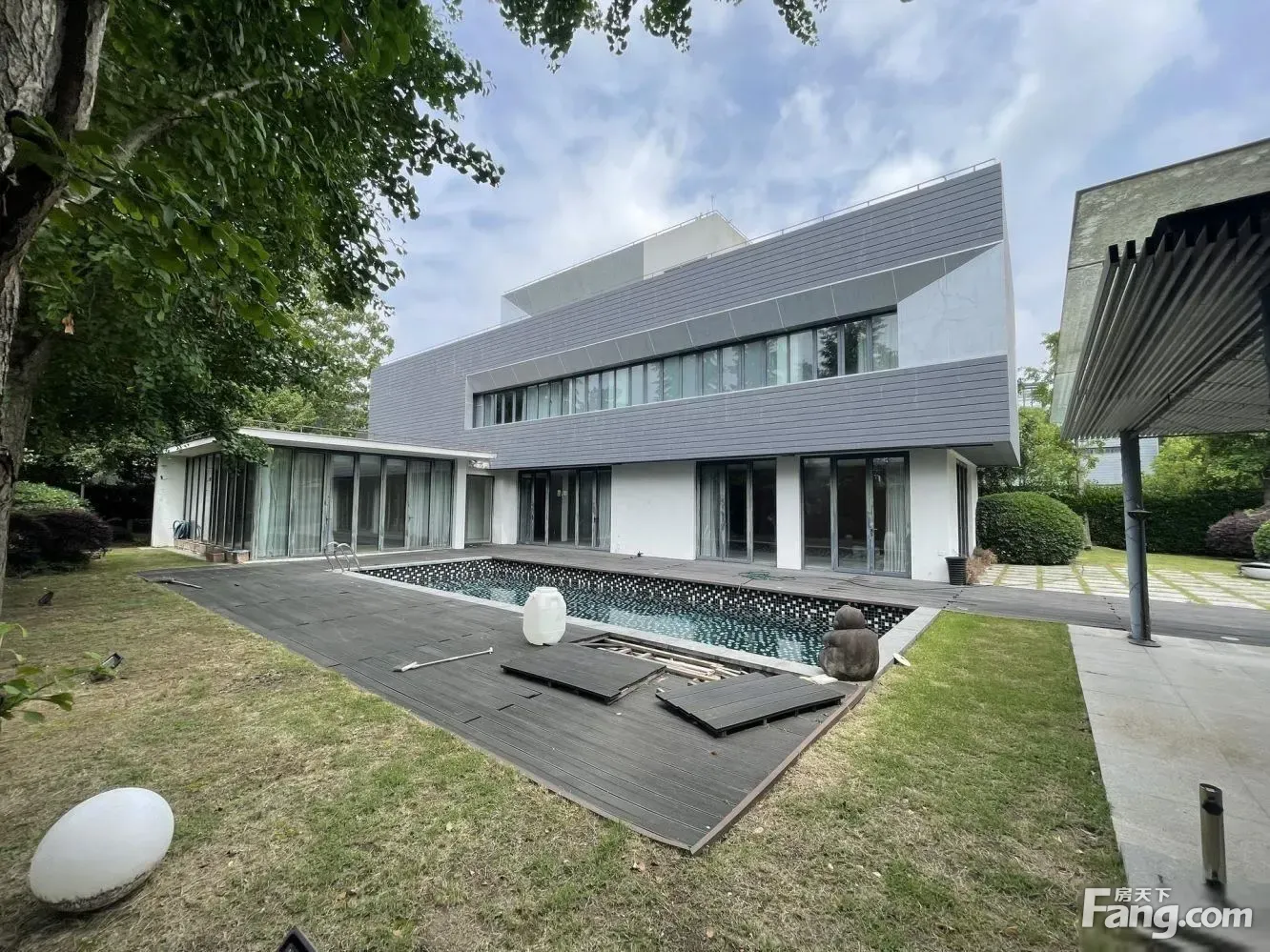 【产证信息】产证面积678平,占1222.22平,其中地上面积449平米,地下室面积228平。 【装修情况】现代精装修 【户型设计】地上2层,地下一层。全套房设计,五房朝南,温馨舒适 【位置花园】花园1200平临中心大河,带露天游泳池,北进门南花园南临河