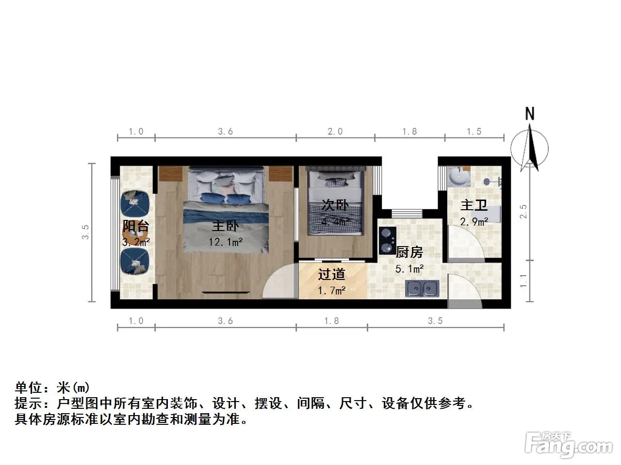 主卧西南朝向带阳台,客厅有窗,厨卫全明。
