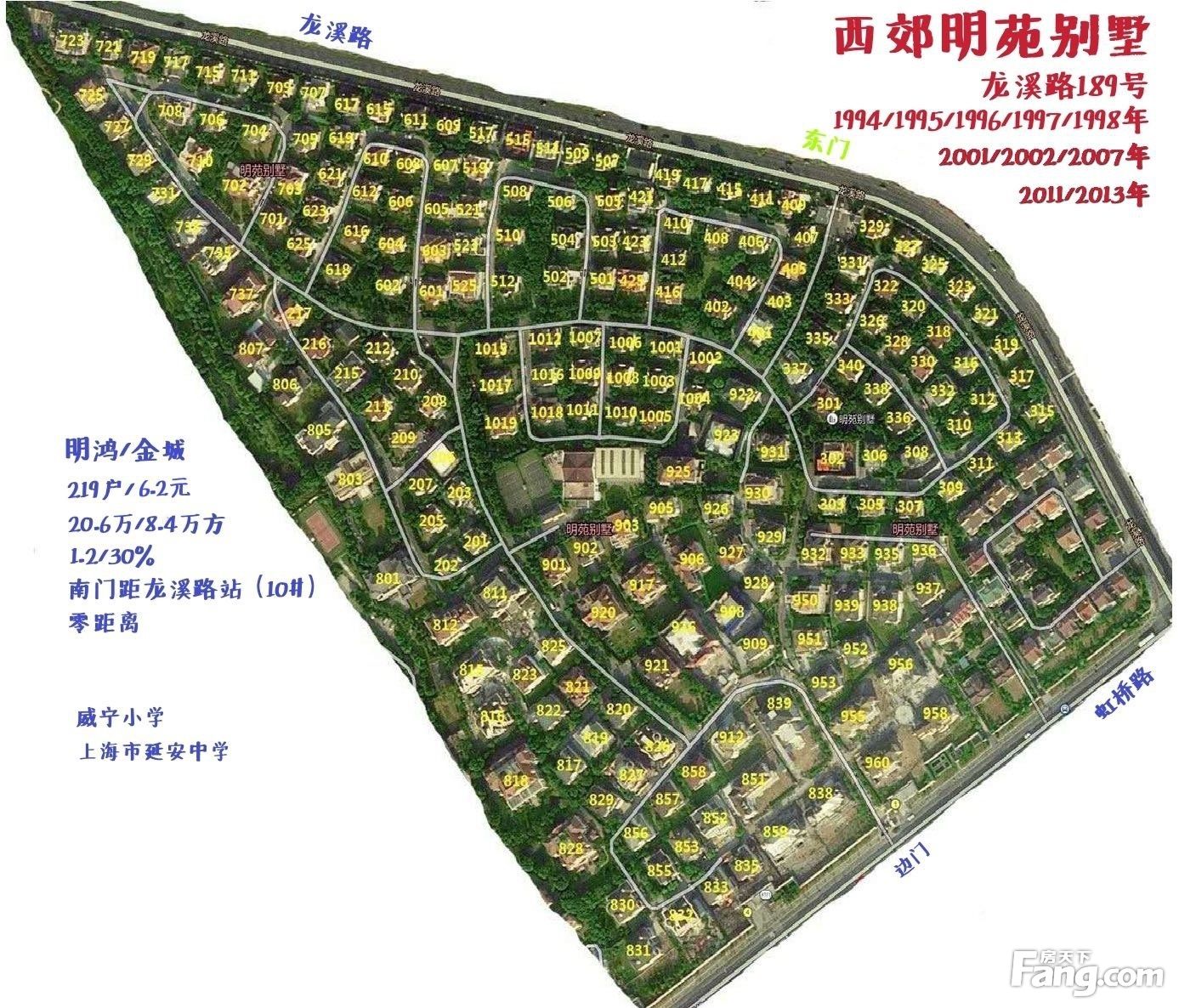 视频是室内外局部,具体室内外详细情况,请联系我带您实地考察吧,感谢您在线上浏览 位置特色:是组团独栋的边套,所以采光与视野与私密性更佳 产证占地:1577.4平, 产证建筑面积1509.07平,地上836㎡地下673㎡ 8房5厅7卫 地上2层加地下一层,,阁楼是赠送的 地下室带泳池,北进门 集中南花园 毛坯, 挑空客厅 公司产权税费各付 验资,就可以申请看房了 一楼:2卧室朝南加公区和一个茶室,4.5米 二楼:6个卧室4个朝南。3.4米 三楼:是开.发.商赠送的面积,高处有3米四周是斜坡造型,可用空间也有300平左右 地下室:4个大房间以及各类功能间,3.9米,泳池16米*5米 === 西郊明苑别墅:龙溪路189号 是长宁区非常著名的高热度别墅小区;附近是鼎鼎大名的檀宫、西郊国宾馆 小区大约建于1993-2013年之间,二十几年来都是长宁区新泾镇【西郊别墅区】每一年均咨询量蕞大并且成交量蕞大的小区 地处虹桥路、虹梅北路,西郊宾馆,小区环境优美,绿树成荫,空气清新,各型别墅错落有致,欧陆风情。 小区成功吸引了东南亚籍很多企业主和各国驻沪机构的外籍人员及国内行业领袖人士的青睐,让客户感到物有所值,彰显尊贵。 小区整个建筑的外观既有欧式轮廓,又不乏东方的细节,环境优美,绿树成荫,空气清新,各型别墅错落有致。 小区一共分四期,一期约1993至1996年、二期约1997至2002年、三期约2007至2013年、四期约2013年。 户型达30余种,入门级产品237平起,面积从237平至2000平; 一期二期都是无地下室,面积段240-372平,户均占地约500平,每户带私家花园,只有16户是带地下室 三期都是带地下室的大户型,户均占地基本1亩起,每户带私家花园 物业:上海高地物业管理有限公司;报修电话021- 物业费:6.2元 绿化率:0.6 总户数:219栋 容积率:0.4 占地面积210000平方米 建筑面积84000平方米 主力户型: A1户型 236.86平 10户 A2户型 240.97平 12户 B1户型 269平 9户 B2户型 272平 8户 B3户型 274.19平 12户 C1户型 304.36平 17户 C2户型 305.86平 7户 C3户型 306.66平 19户 D1户型 325.63平 16户 D2户型 328.5平 5户 E1户型 372.49平 6户 E2户型 373.45平 4户 E3户型 376.12平 1户 F1户型 661.96平 4户 F2户型 731.72平 4户 周边配套齐全、繁华、成熟 小区南门口是地铁10号线龙溪路站;驾车约12分鈡到虹桥机场/虹桥高铁站;附近有虹桥路/延安高架/中环/外环等多条主干交通线环绕。距虹桥机场须开车5分鈡,去中环、延安高架须开车3分鈡 上午9:30早高峰,从【明苑别墅】到新天地、徐家汇、陆家嘴、等各大核心地段的,平均用时约30分鈡