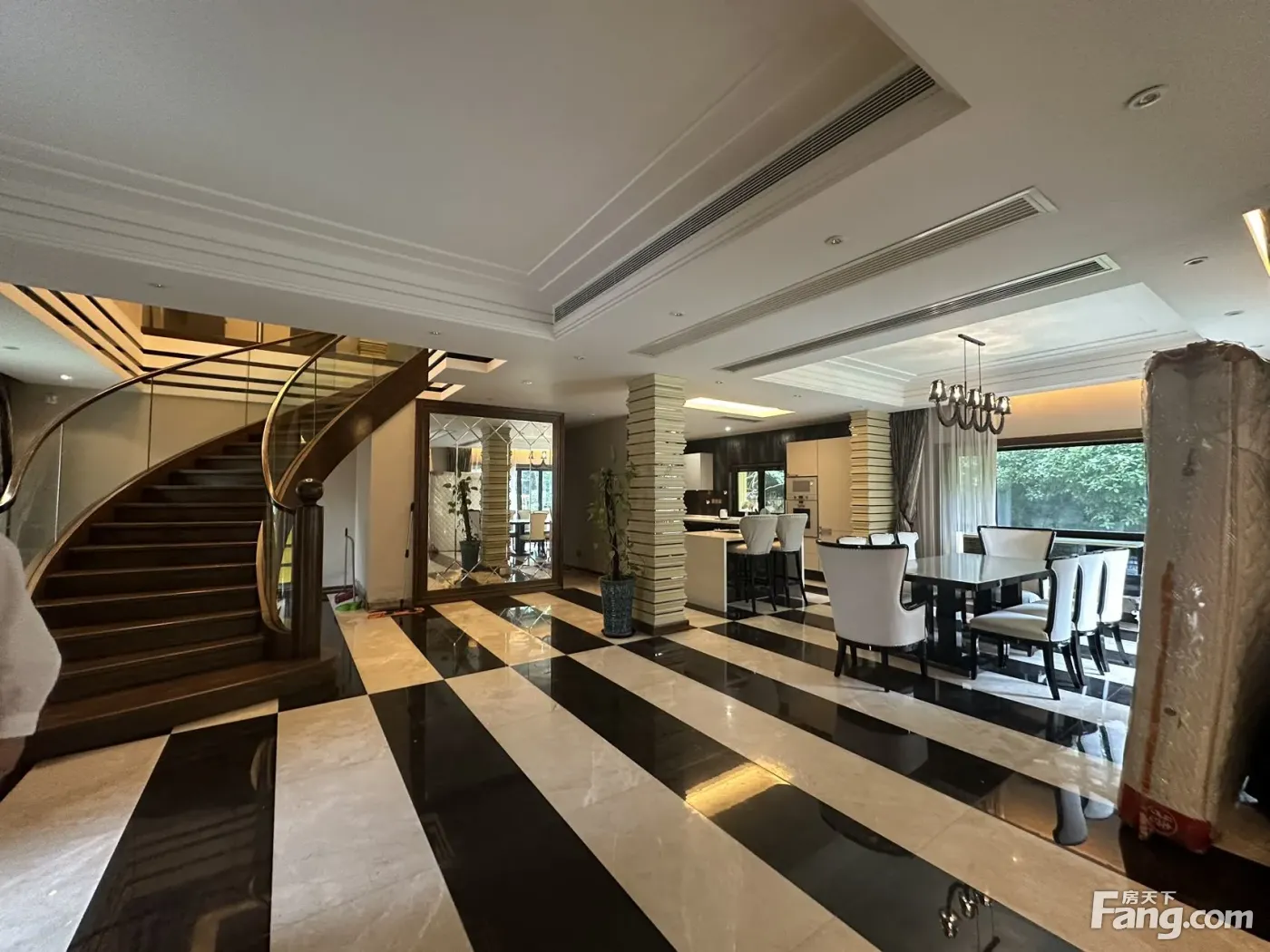 虹桥中华园:皇朝别墅小区2期 独栋别墅 1楼北进门,没有做正式的卧室,很大面宽,南端是开放式厨房与餐厅+保姆套房,旋转楼梯 2楼:北端1个套房,南端有2个套房,此外还有一个西北角的房间 地上两层, 无地下室 大花园 2019年左右精装 = 皇朝别墅、虹桥中华园:长宁区虹桥路2388号 小区1995~2000年竣工 地处西郊区域,大隐于市,小隐于野,环境幽静,舒适温馨居家的港湾,小区保安严格管理,进出都有门卫排查,设备齐全而且交通方便。 小区有会所,游泳馆,羽毛球馆,健身房,内部餐厅(私房菜),洗车馆,足不出小区尽享品质惬意的生活。小区内部是环形道路,夜晚来临散步安全 开发商:中华企业股份有限公司 古北物业。物业费:别墅4.5元? 绿化率:40% 建筑面积:约9万平方米 占地面积:约16万平方米 容积率:0.6 户型面积:300平-700平 皇朝大门采用古希腊三跨门,由16根爱奥尼克圆柱加上中跨半圆拱形组成。 皇朝别墅小区内东部与中部的74个独栋别墅与类独栋别墅一般是被称为【皇朝别墅】,202套联体(联排+双拼)名为【虹桥中华园】,56户4层高的公寓;蕞西端8个独栋划入虹桥中华园 小区东门500米有10号线动物园地铁站,400米到达71路公交站,外滩。车行1.5公里可到爱琴海购物公园,车行4公里可达古北、车行5公里可达虹桥天地,西郊百联。小区北边是上海动物园,天然的氧吧。1公里上高架,出行方便