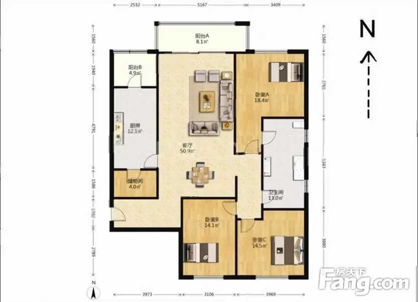 193平大4房!客厅餐厅相连(大长厅带景观大阳台),房型3房2厅2卫,2房朝南,1房朝北,高区采光景观视野好!可看小区花园和7000平会所景观!