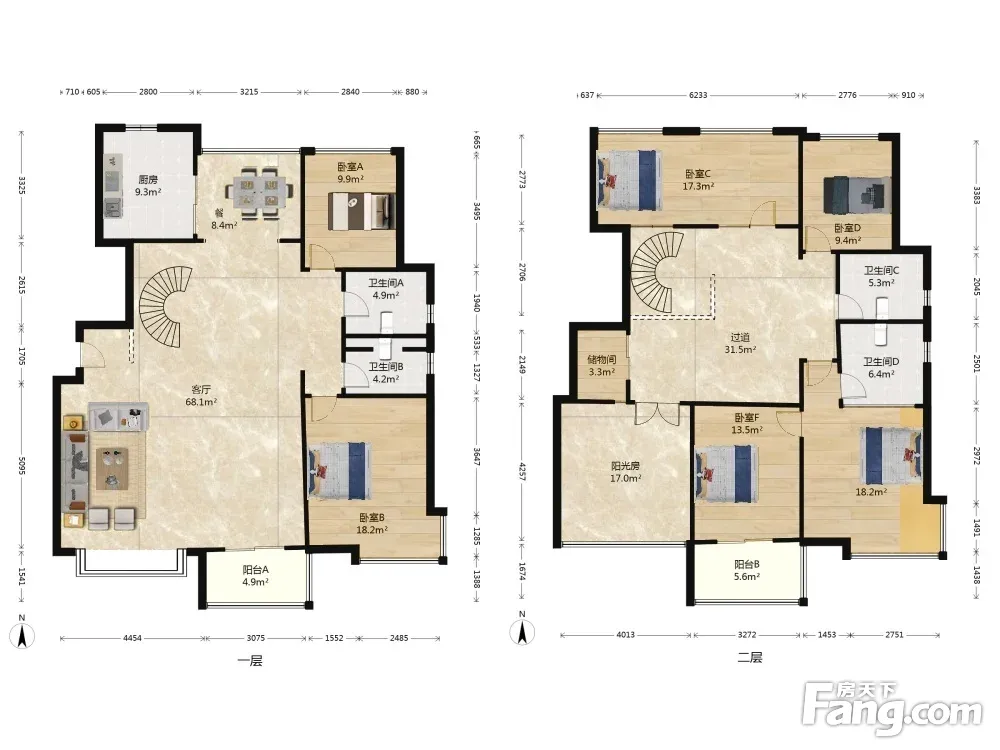 楼上楼下一样大的,带挑空的客厅,很开阔的视野,明亮的采光!房间很多,全明的户型,