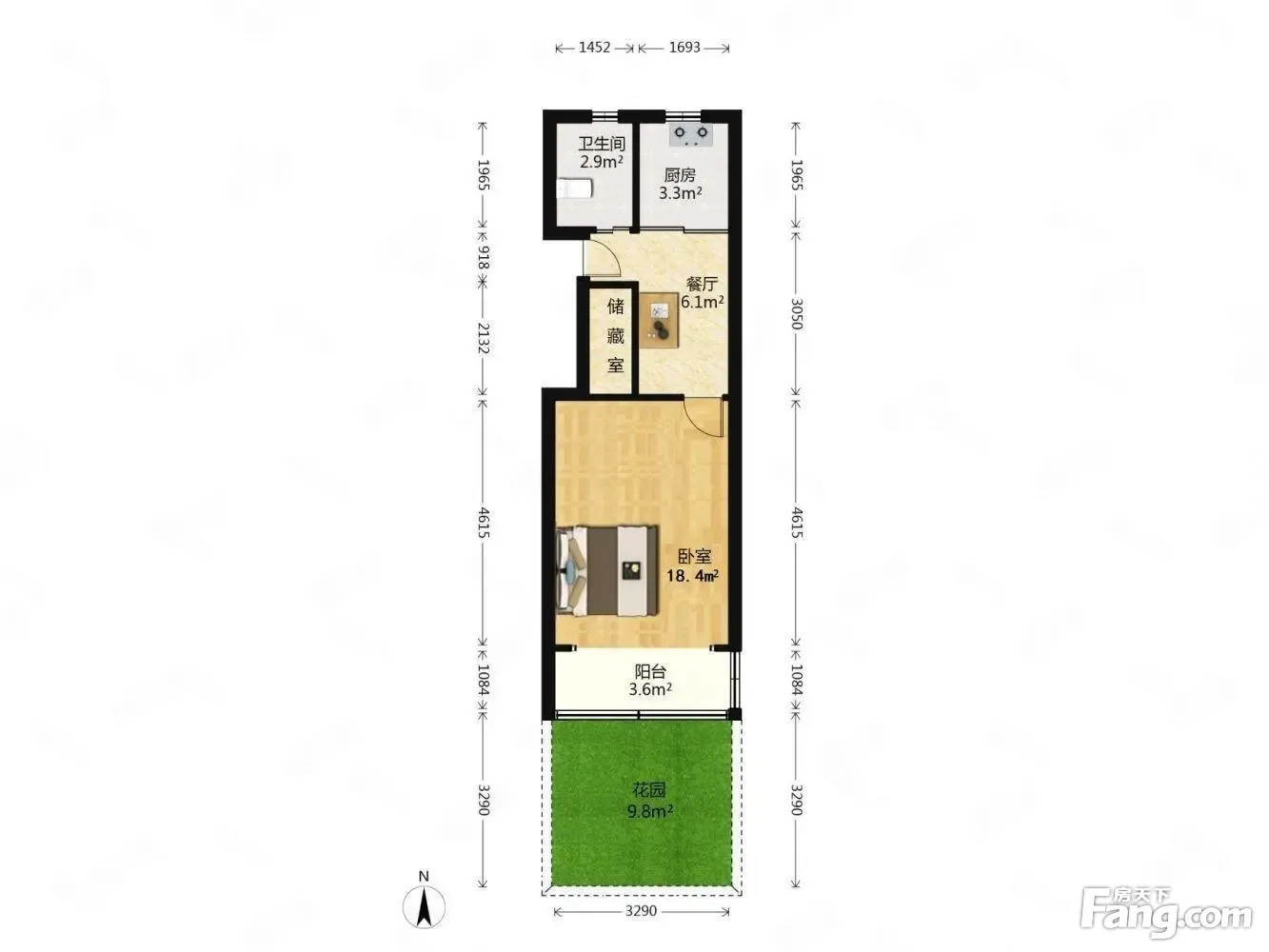 注:房子户型是边套全明大南北1房1厅户型 □户型装修介绍□ 38.59平米,1房1厅1卫;全屋带地暖,所以厅用的地砖,卧室用的复合实木地板;房东就是做家居这一块的,所以很多都是进口的; 厅墙面整体呈现暖白风格,地砖呈典雅白色,厅有6个平方餐桌加鞋柜; 卧室都是用的风景背景墙,精致大床,灯具是美国进口的,典雅白的橱柜也是品牌; 主卧有19平朝南带4平米阳台; 送15平花园,也是搭建装修好的,目前没有违章可以正常交,易。 卫生间有4个平方朝北;厨房有5平方朝北全新未使用过; □位置车位介绍□ 不靠路,位置很好,车位有1个固定车位,可以转给下家。
