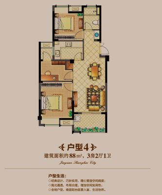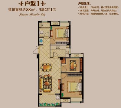 佳源上海小城户型主要有88平-90平的户型方正,明卫,明厨,主卧朝南的三居 、120平-120平的南北通透,主卧带卫,主卧朝南的四居 。