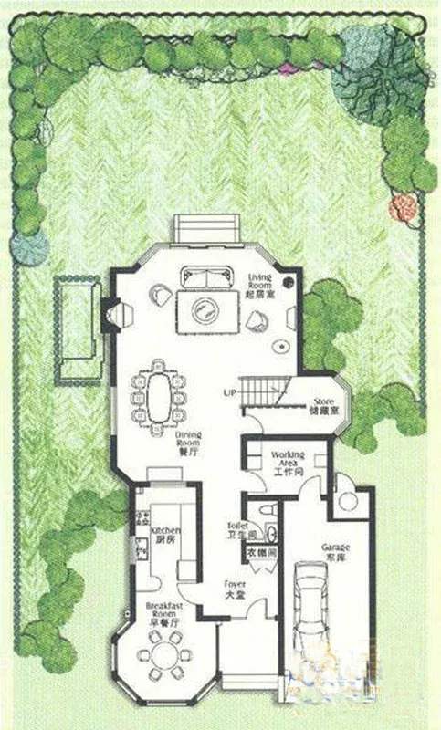 此房标准5房设计,北面进门进门口玄关,玄关右边是车库,左边是客厅。车库后面是保姆房洗衣房。厨房连着餐厅和茶客厅厅东西向朝南带落地窗。旋转楼梯上下。二楼4个卧室都是套房。2房朝南带阳台,2房朝北。其中主卧南北通透。