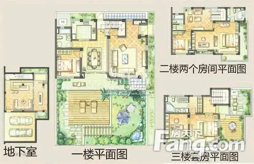 下沉式花园,花园直接进出地下室,地下室全明的层高3米,相当于一楼。一楼客厅挑高4.5米特别大气。一楼老人房套房。二楼三个卧室其中2房是朝南的带露台,1房朝北带露台,都是套房。