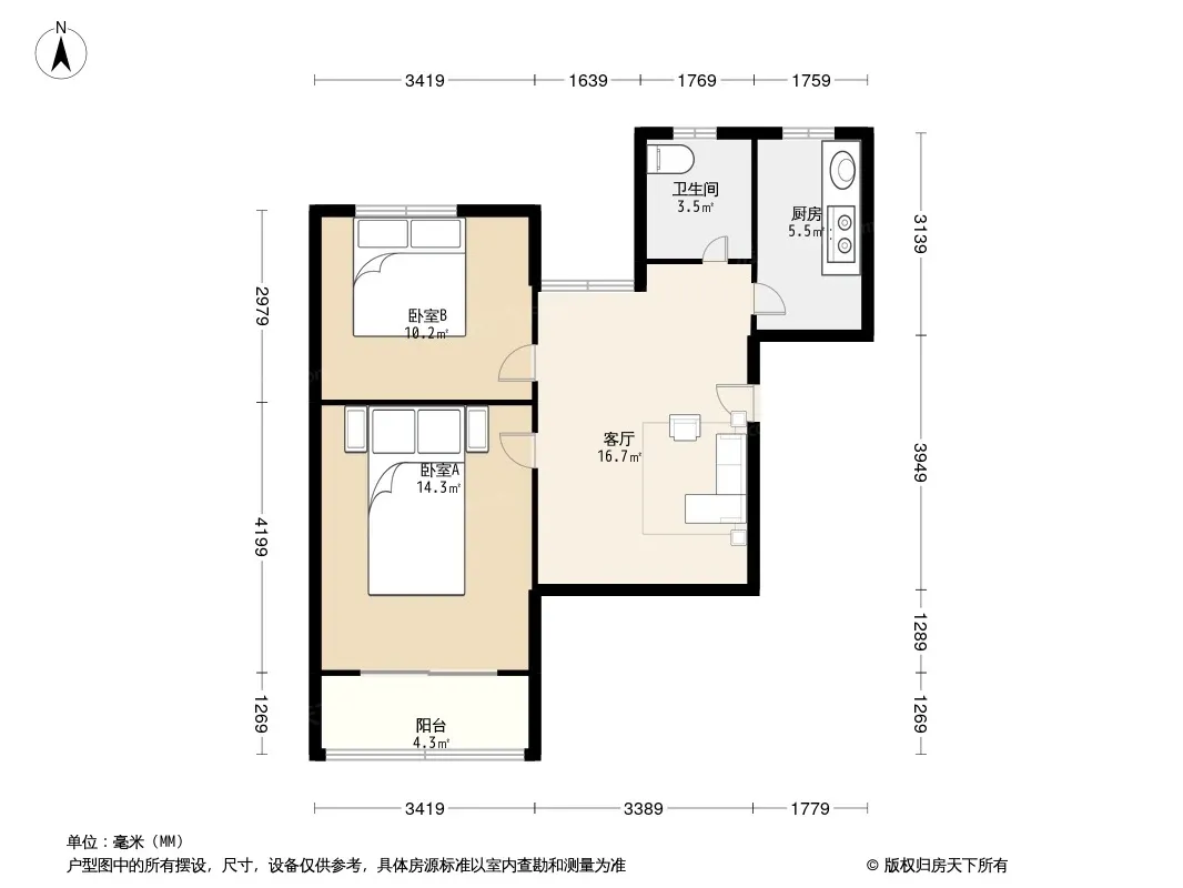 户型齐全,主打户型方正,明卫,明厨,客厅朝南,主卧朝南二居