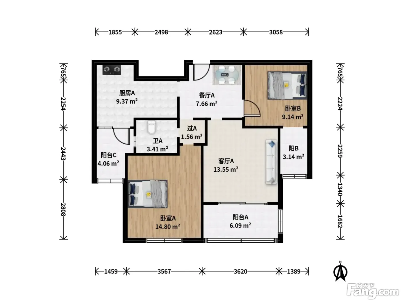 户型齐全,主打双阳台,双卧朝南二居