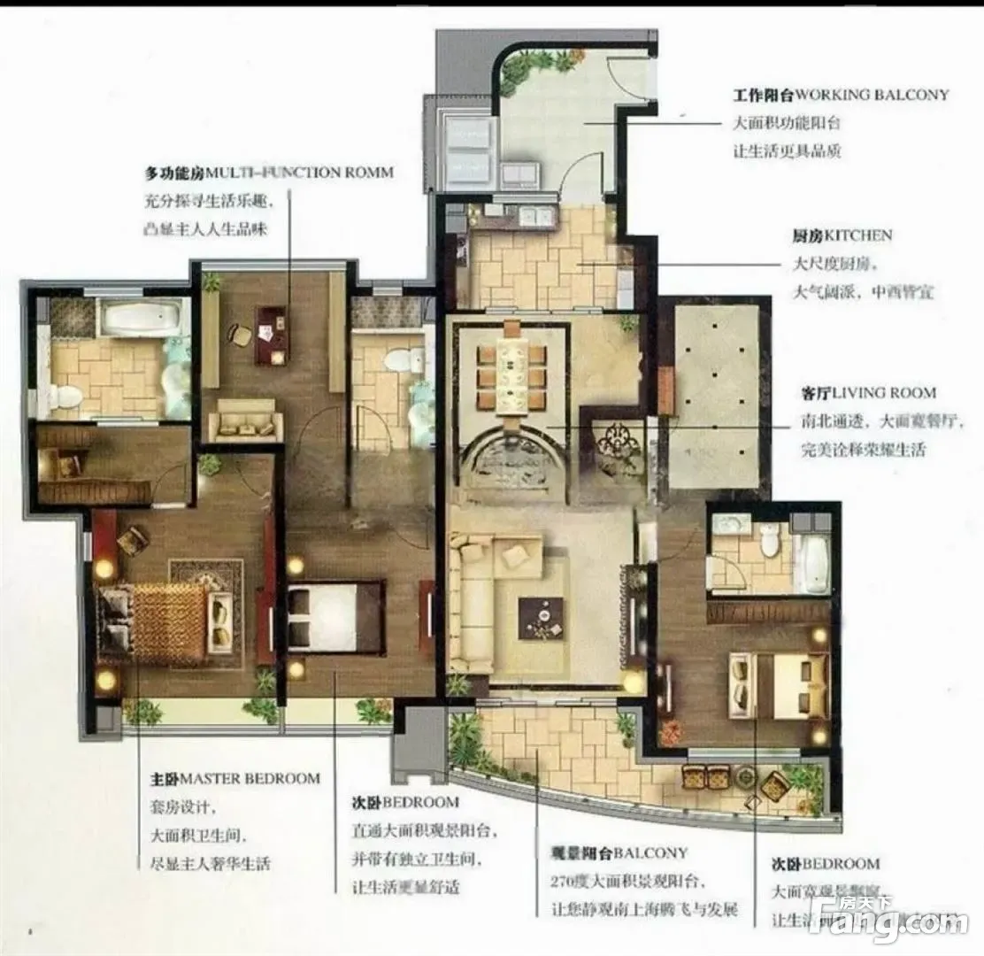 户型齐全,主打户型方正,明厨,独立衣帽间,明卫,双阳台,双卧朝南,主卧朝南三居