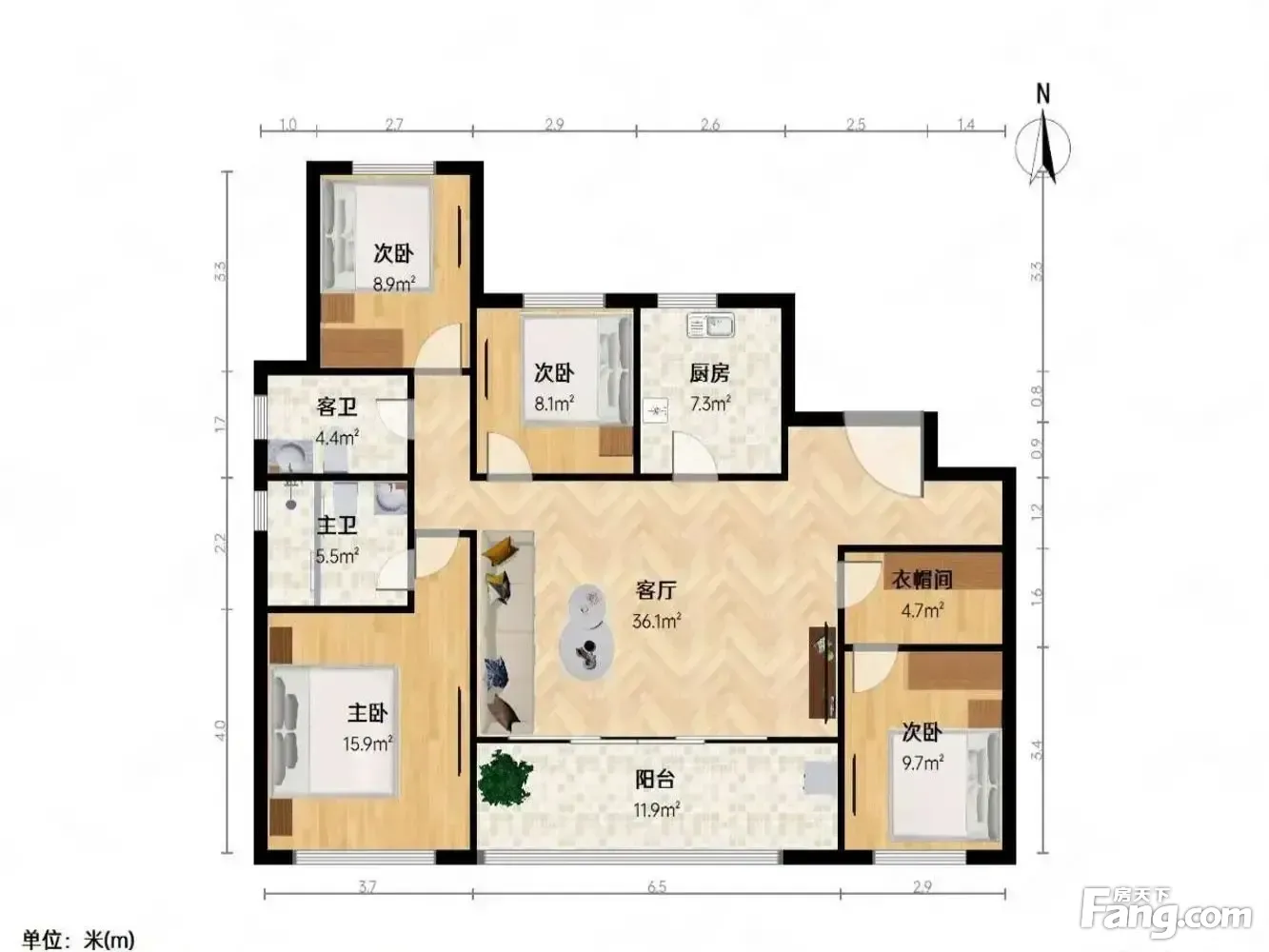 户型齐全,主打南北通透,全明格局,户型方正,三开间朝南四居