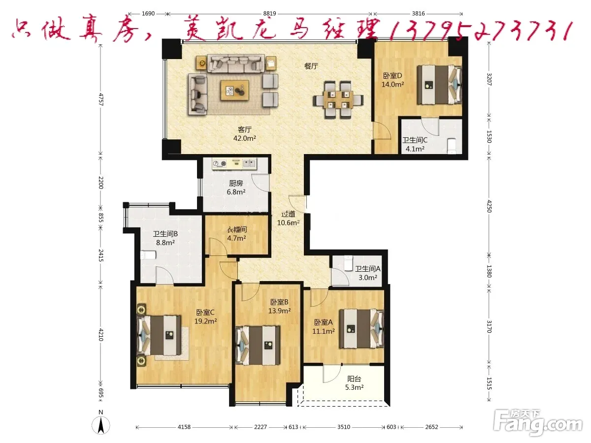 三房朝南,一房朝北,4房2厅3卫,户型正气。