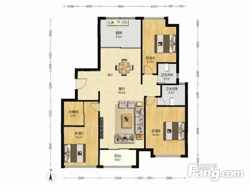 户型齐全,主打南北通透,主卧带卫,卧室带阳台三居