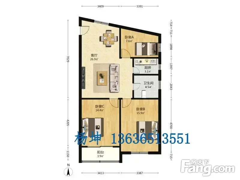 华利公寓3居109.63平南北朝向视野开阔全明采光好
