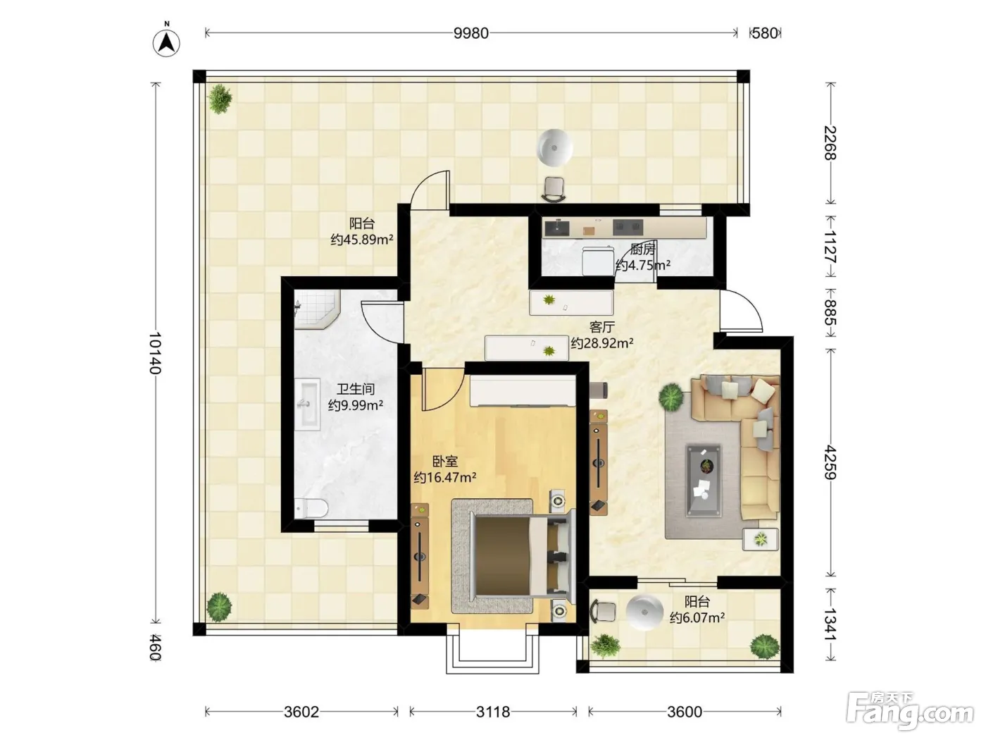 丽和苑 朝南一房一厅 带露台。。