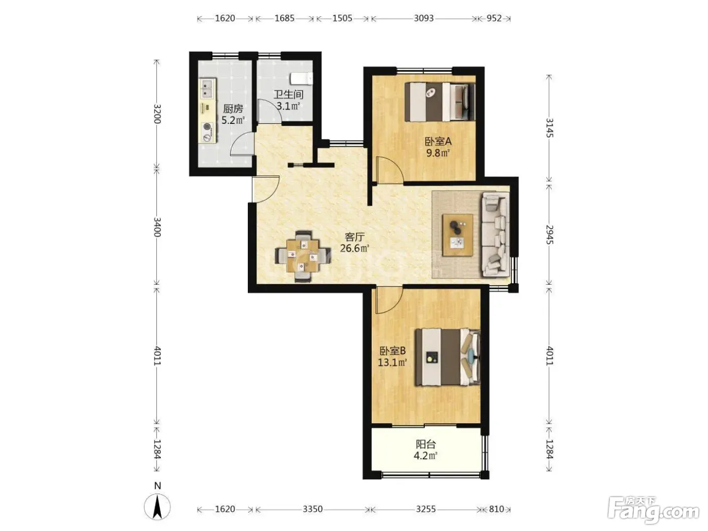 户型齐全,主打户型方正,明卫,明厨,客厅朝南,主卧朝南二居