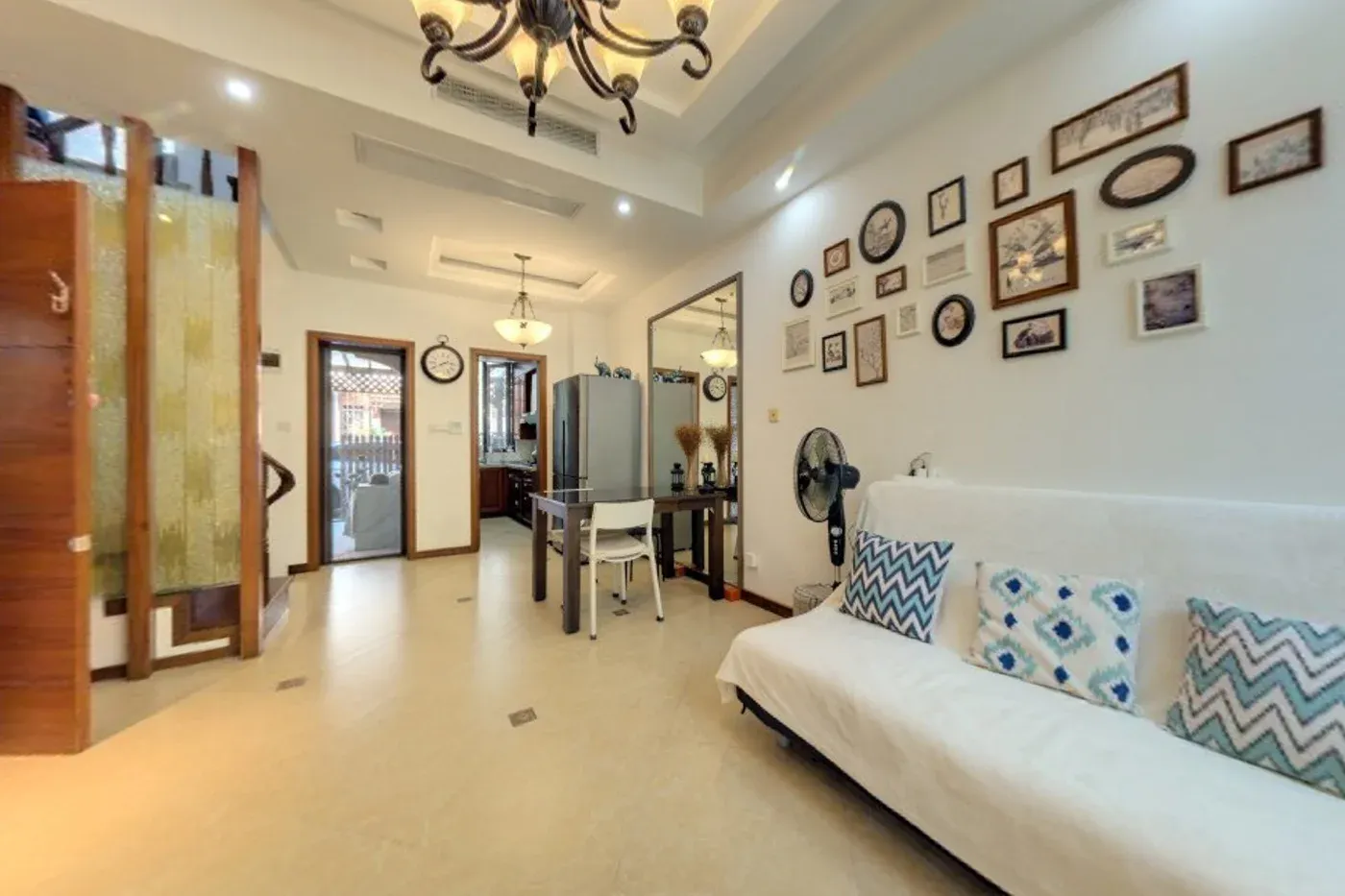 小区门口月台路上有两个生鲜商城,供应蔬菜水果、生活用品等。小区西边有明中广场,盒马生鲜等,东边弘基,东北方向有家乐福、亚繁亚乐城、永辉等。 新南路有新桥镇社区卫生服务。 装修描述 这套房子整体是新中式,一楼采用瓷砖,实木家具,环保,便于打理,南花园,北车位,二楼南北两个房间,木地板,三层大套房。车库没改,可以停下两辆车。