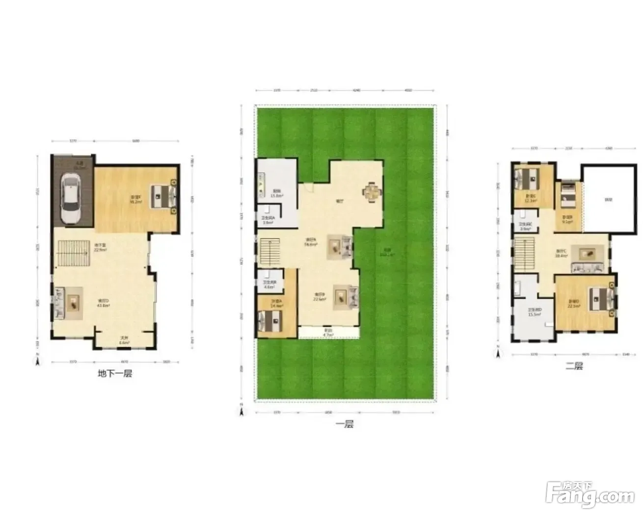 面积:地上267平米,地下150平米;花园500平! 看房:有钥匙; 装修:毛坯; 税费:满五年; 贷款:无; 卖点:房型好,采光好,全部套房设计,一楼带老人房,客厅,中西双厨,二楼3个套房