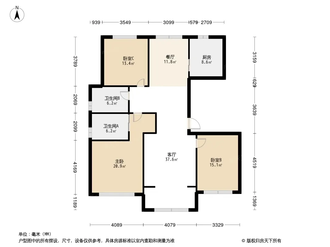 此套房型是3房2厅2卫,两个房间朝南,一个房间朝北,客厅南北通透,飞机户型,厨卫全明。