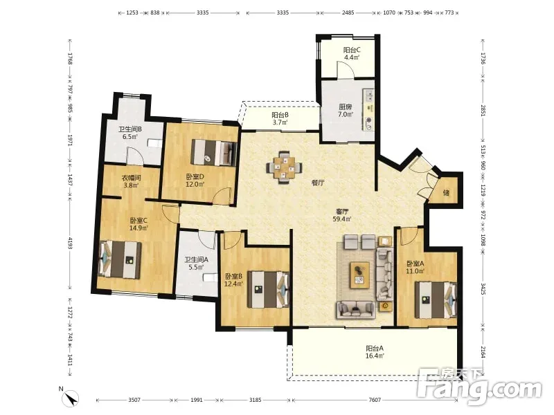 户型齐全,主打户型方正,独立衣帽间,明卫四居