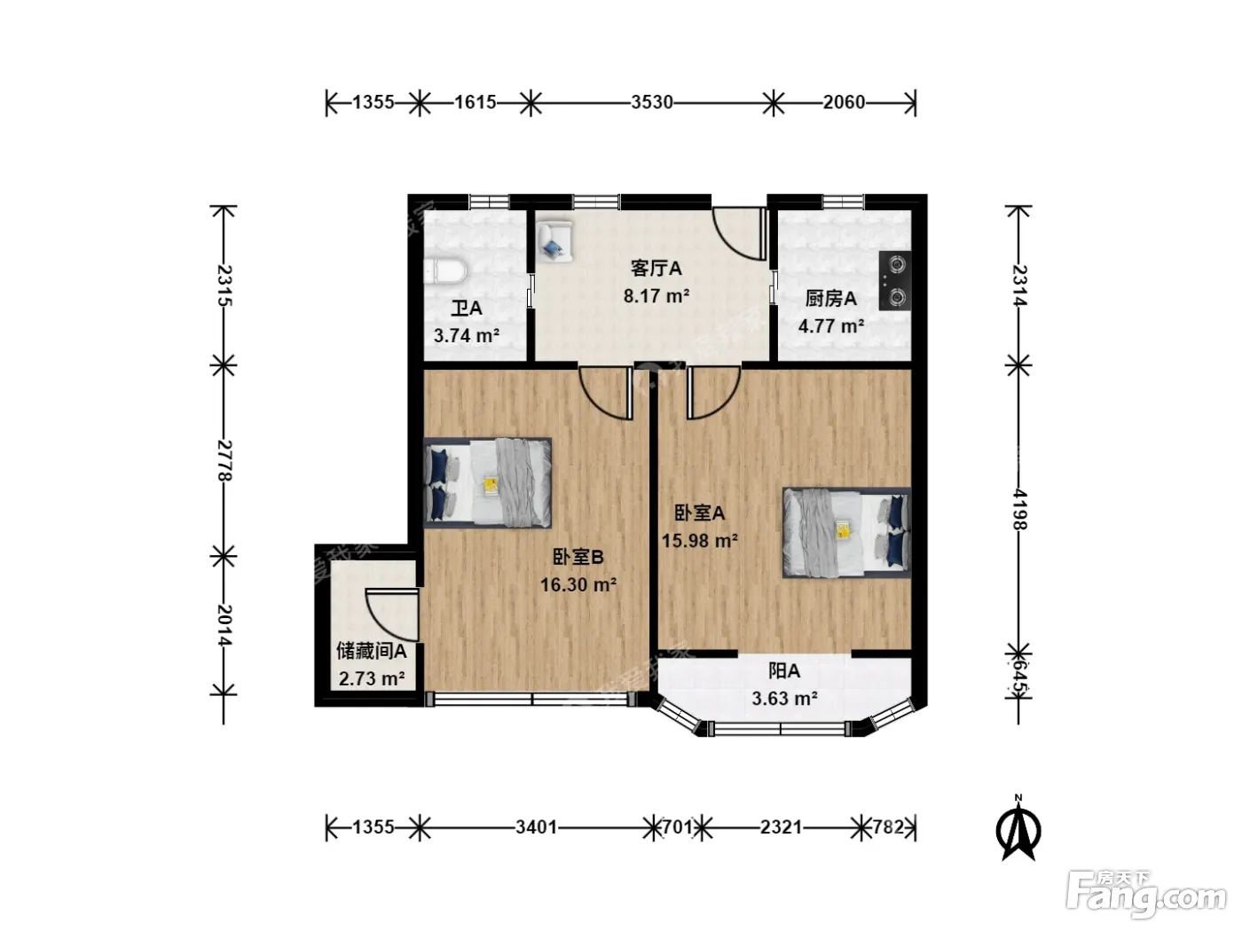 户型齐全,主打明卫,明厨,客厅朝南,主卧朝南二居