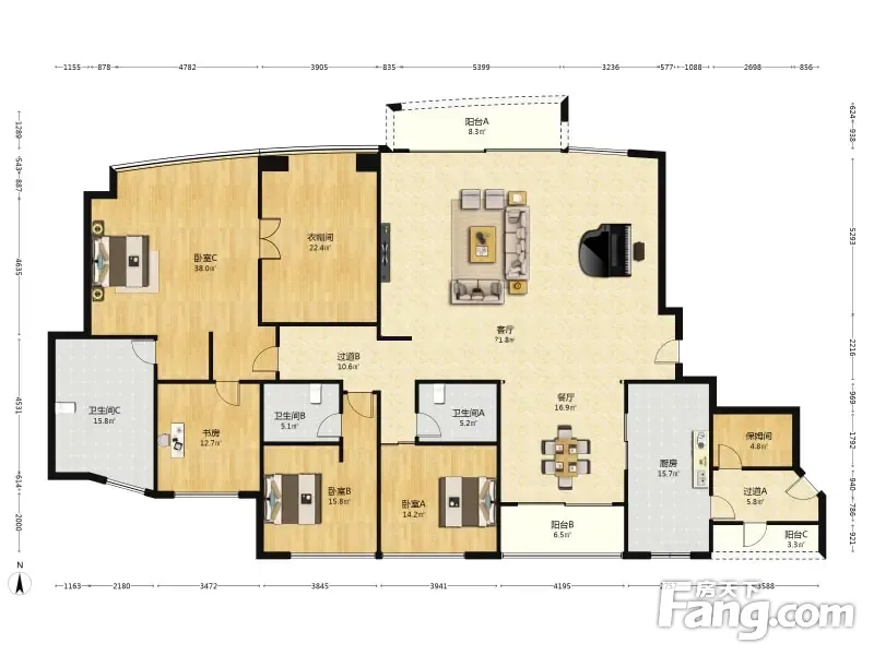 户型齐全,主打露台,南北通透,主卧朝南,带衣帽间五居