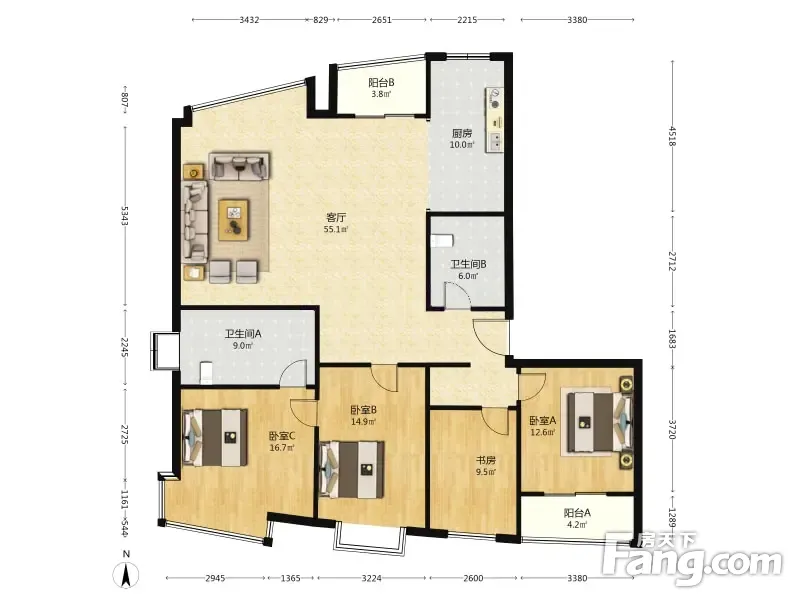 户型齐全,主打户型方正,明卫,明厨,独立衣帽间,双阳台,双卧朝南,主卧朝南四居