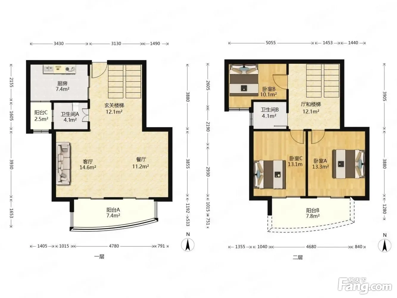【户型介绍】: 房子是3房3厅2卫3阳台,电梯复式房; 全屋定制复合实木白灰地板,厨卫是精装瓷砖; 楼上: 三个房间都是朝南带飘窗的,两房主卧朝南带双阳台,一个主卧13.1平一个主卧13.3平,阳台7.8平,次卧10.8平也是朝南的,带卫生间4.1平,楼上厅+楼梯12.1平; 楼下: 客厅餐厅并排朝南,客厅有14.6平方,另外玄关楼梯12.1平,采光很好; 餐厅有11.2平方合客厅一起带1个7.4平朝南阳台; 厨卫全明,厨房有7.4平方朝南带2.5平小阳台,卫生间4.1平方朝西全新设备未使用过。 【面积布局】: 产证面积131.57平米,全屋新装,可直接入住,设计理念好,不浪费压抑。