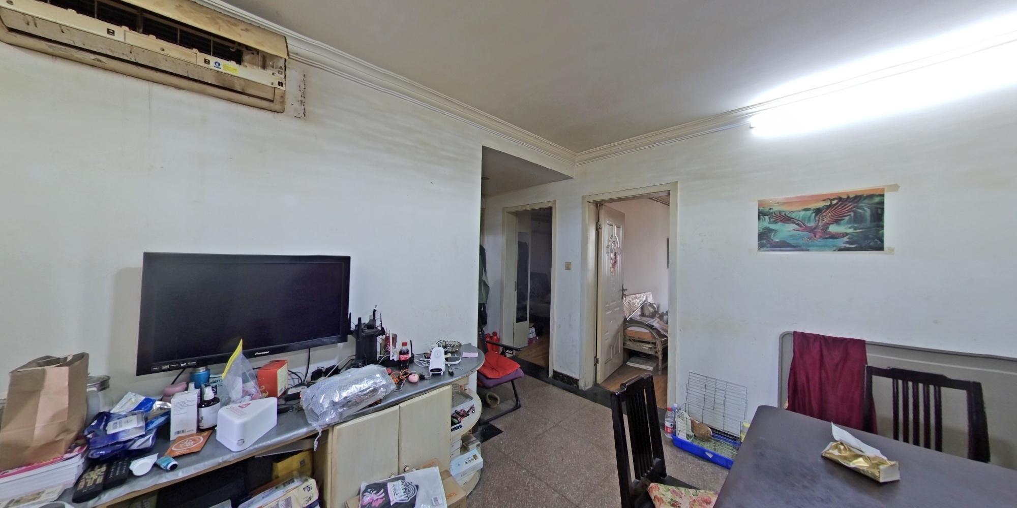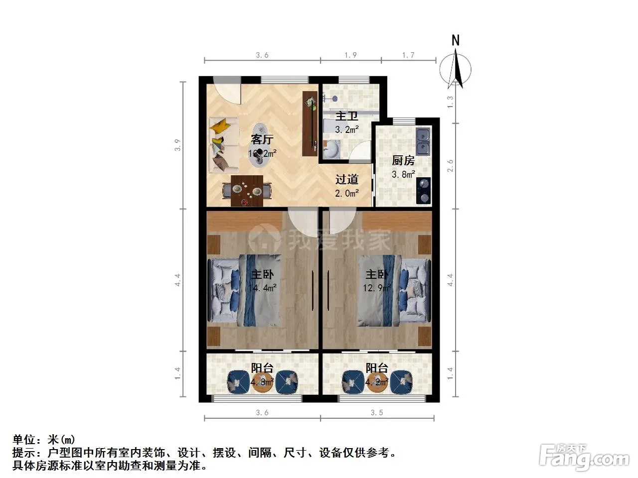 户型介绍:房子是小区标准的双南大两房,进门是客餐厅,左边是厨房和卫生间,两间大卧室朝南带阳台,每个阳台都有5平米的阳台