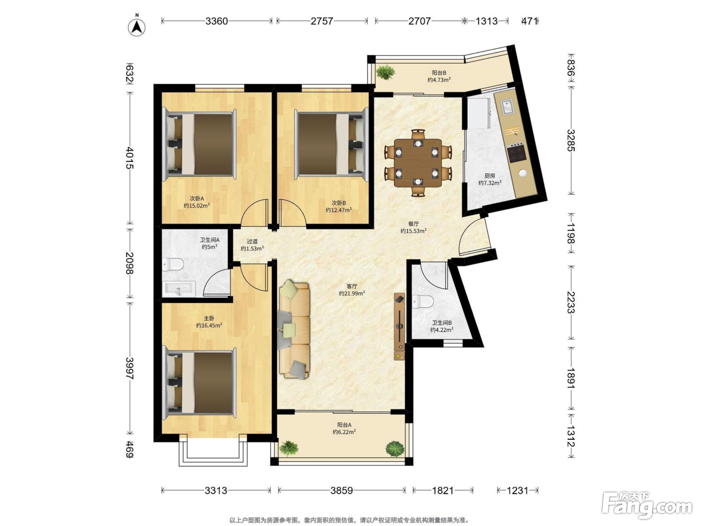 2梯3户,客餐厅南北南北双阳台。3房1南2北,得房率约75%