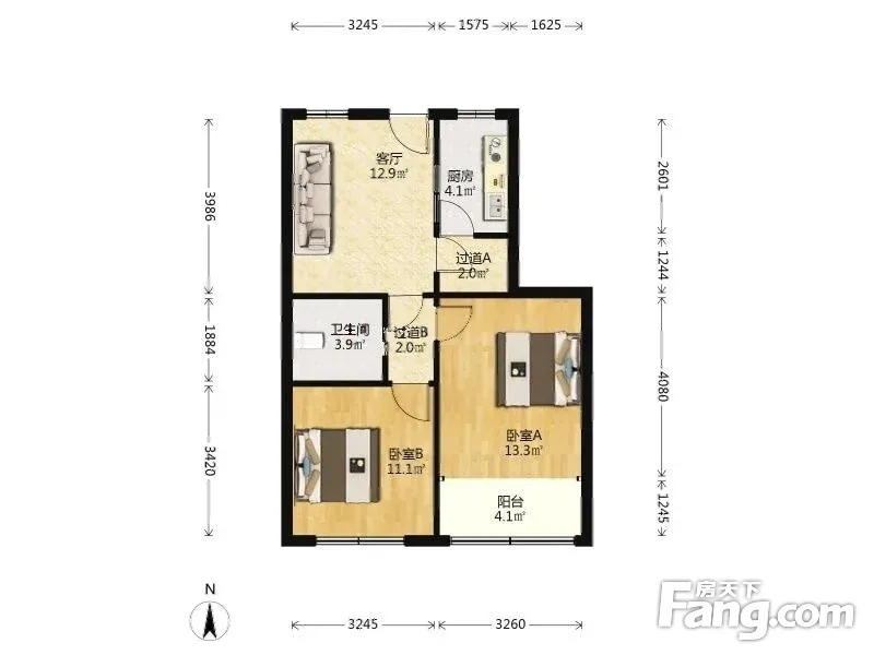 两房朝南带阳台,客厅朝北,厨房卫生间全明