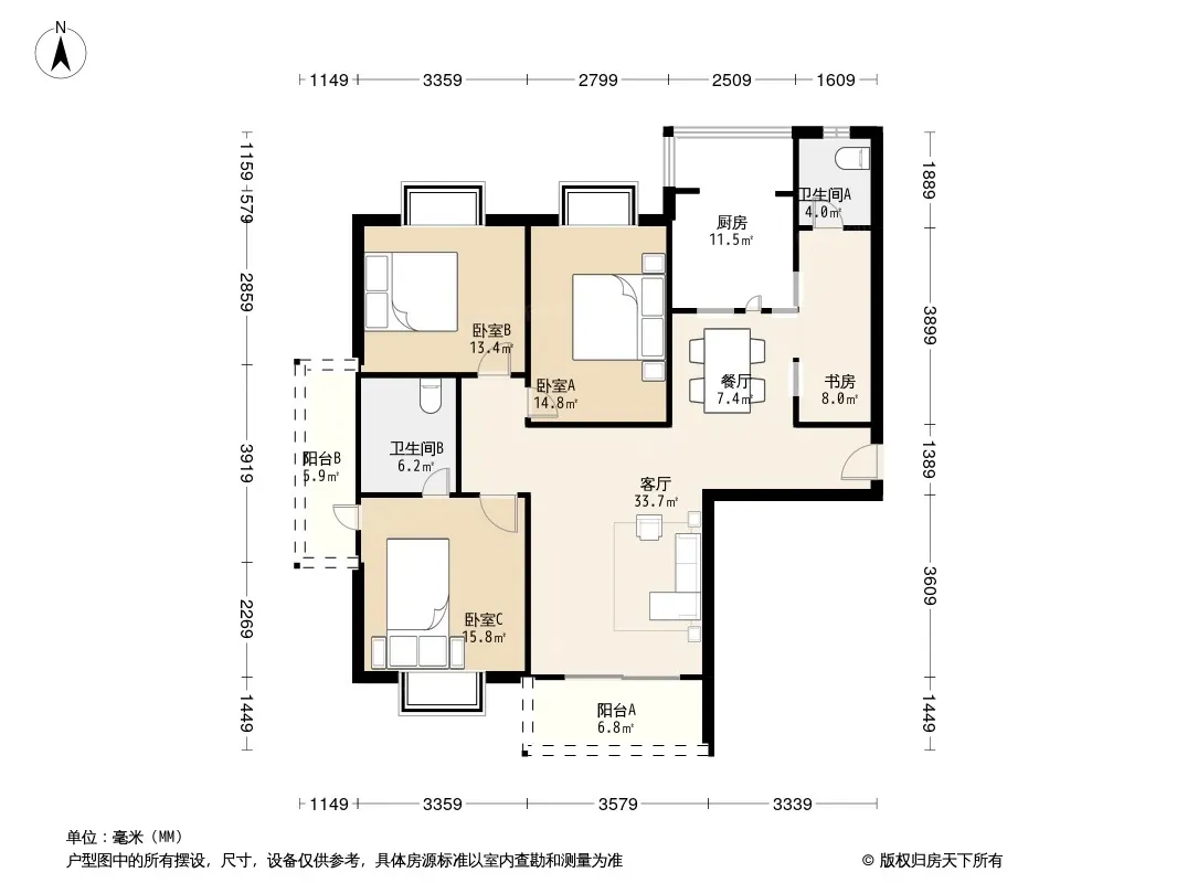 方正户型,南北通两南一北,采光无遮挡