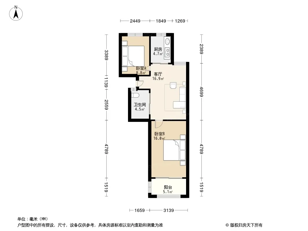 户型齐全,主打明厨,明卫,客厅朝南,主卧朝南二居