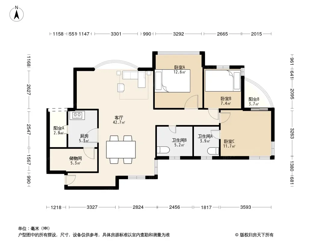 户型齐全,主打明卫,客厅朝南,双阳台三居