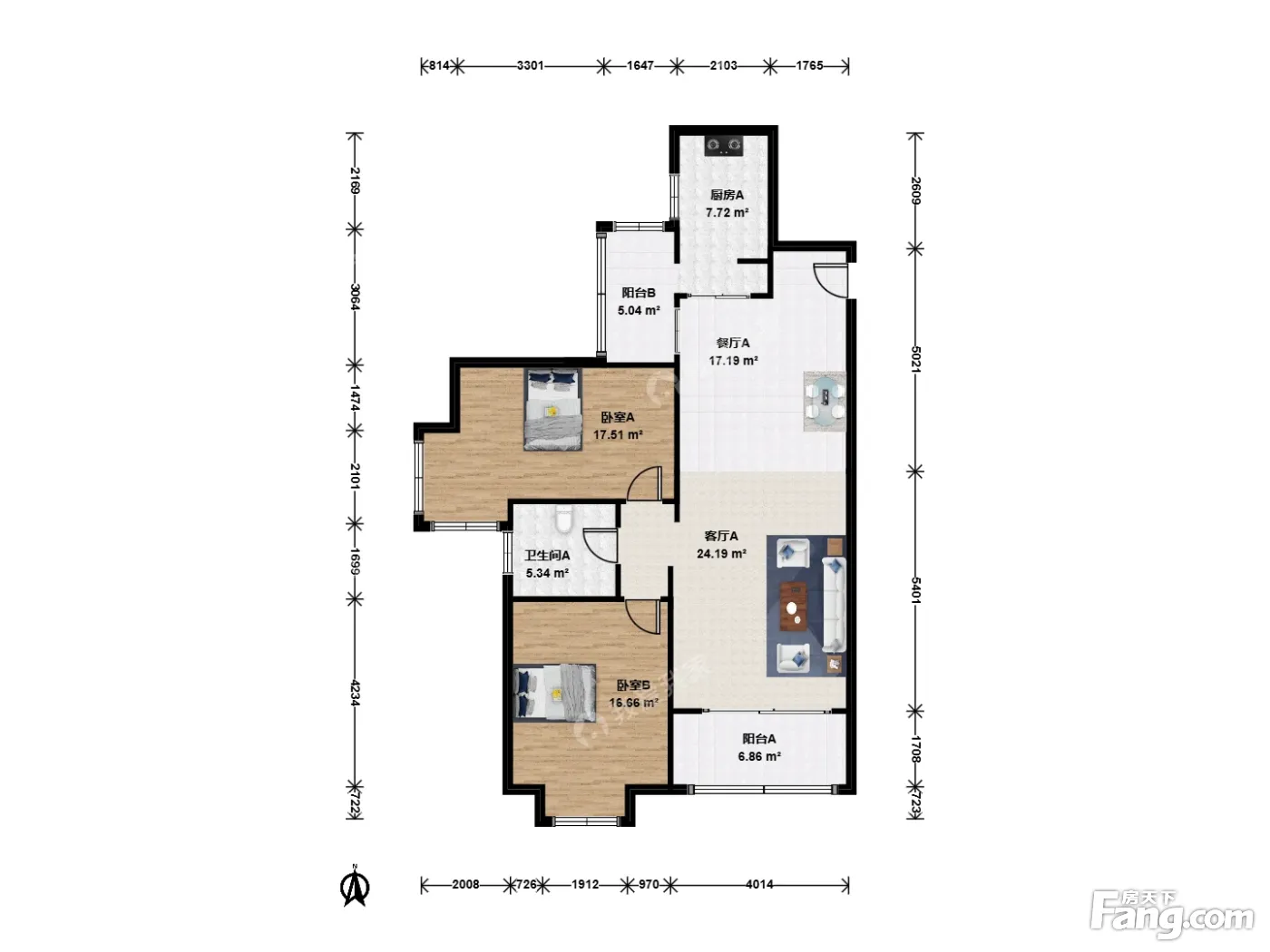 户型介绍:全南两房,客厅相对其他的两房户型大了很多面积,可实地参考
