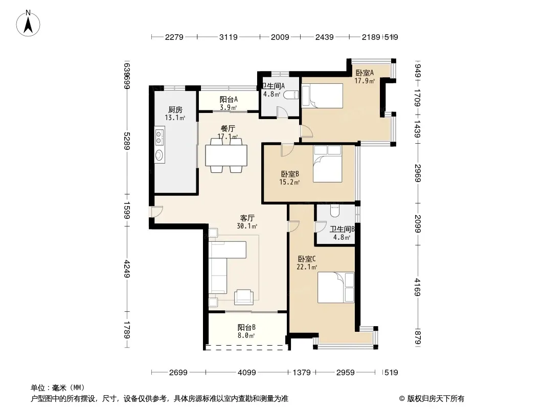户型齐全,主打户型方正,明卫,明厨,双阳台,双卧朝南,主卧朝南三居