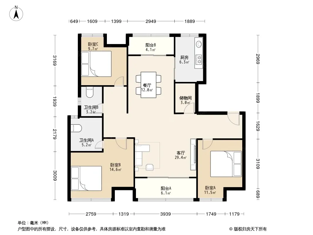 户型齐全,主打户型方正,明厨,明卫,客厅朝南,双阳台,主卧朝南三居