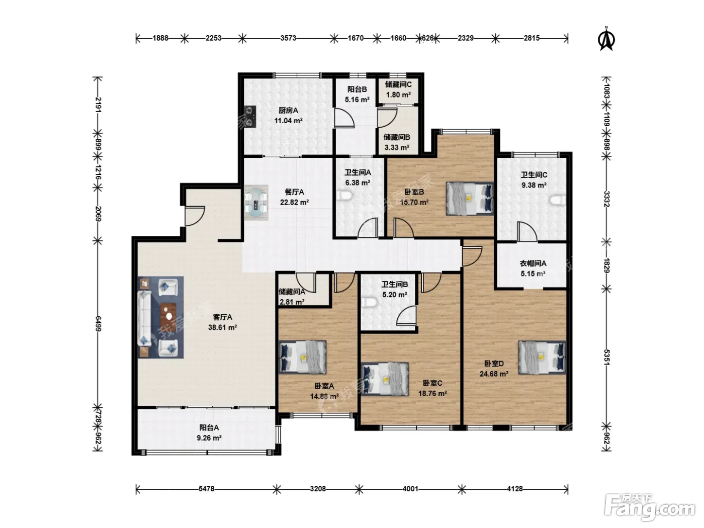 户型齐全,主打户型方正,独立衣帽间,明厨,明卫,双阳台,双卧朝南四居