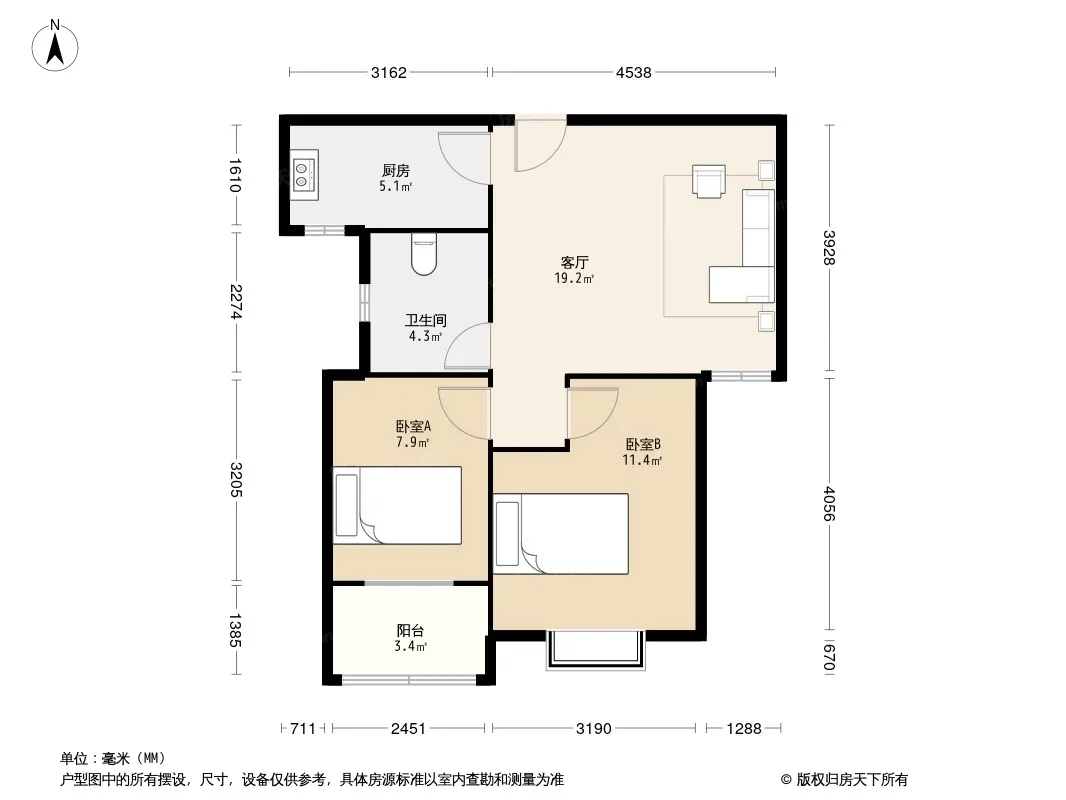 户型齐全,主打户型方正,明卫,明厨,客厅朝南,主卧朝南二居