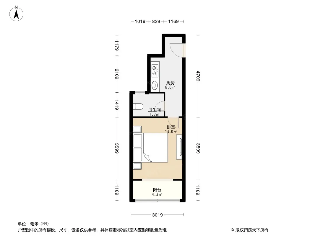 户型齐全,主打户型方正,明卫,明厨,客厅朝南,全明格局一居
