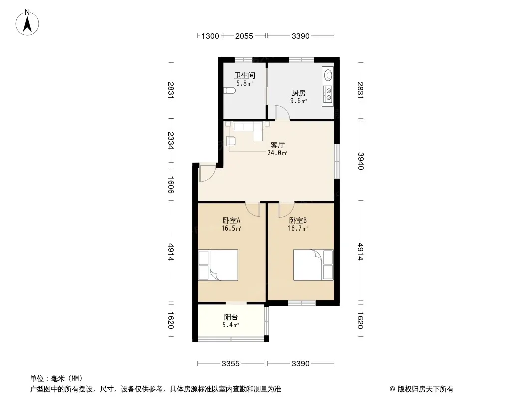 户型齐全,主打户型方正,明卫,明厨,客厅朝南,主卧朝南二居
