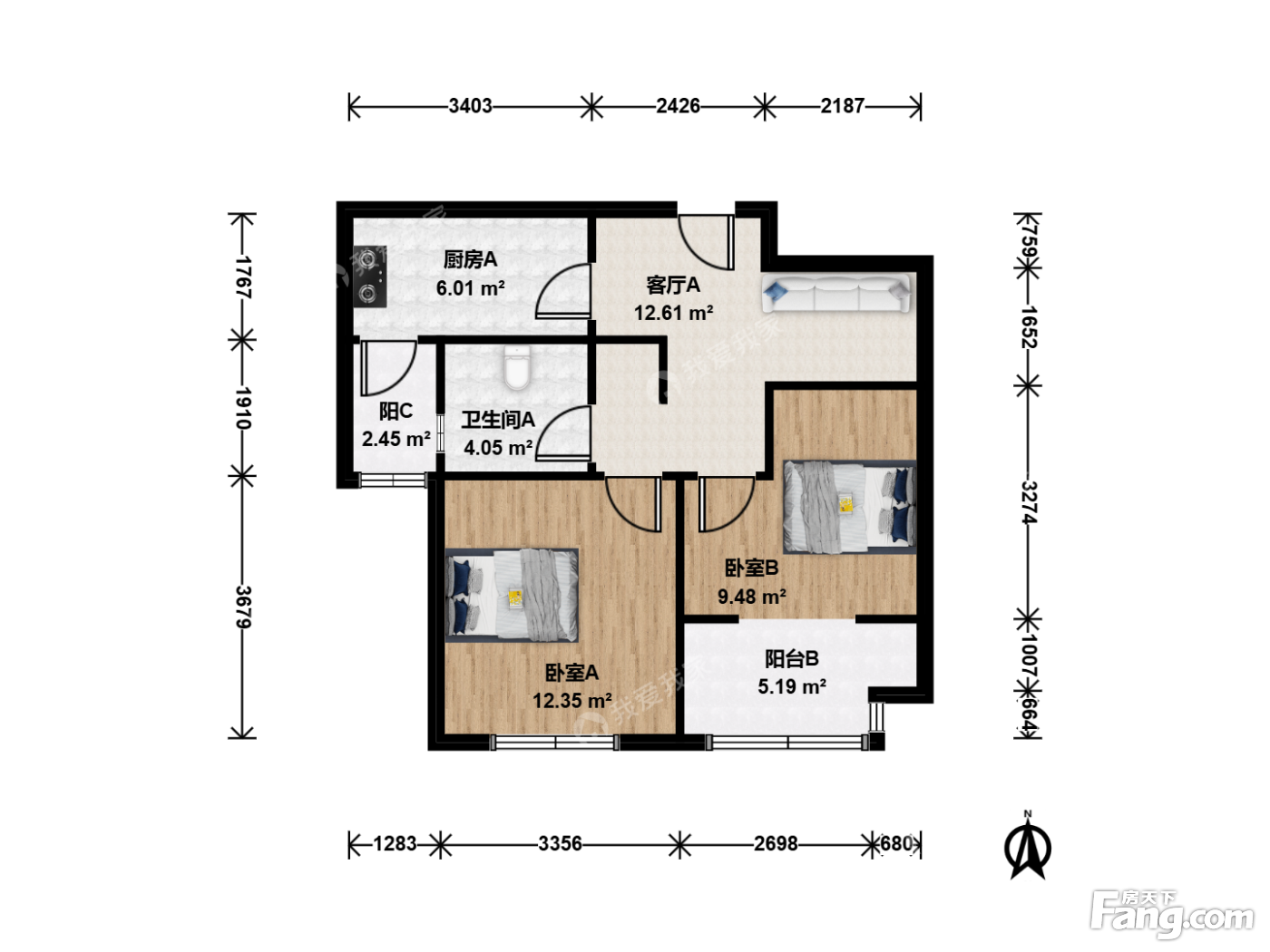 户型齐全,主打户型方正,明卫,明厨,主卧朝南二居
