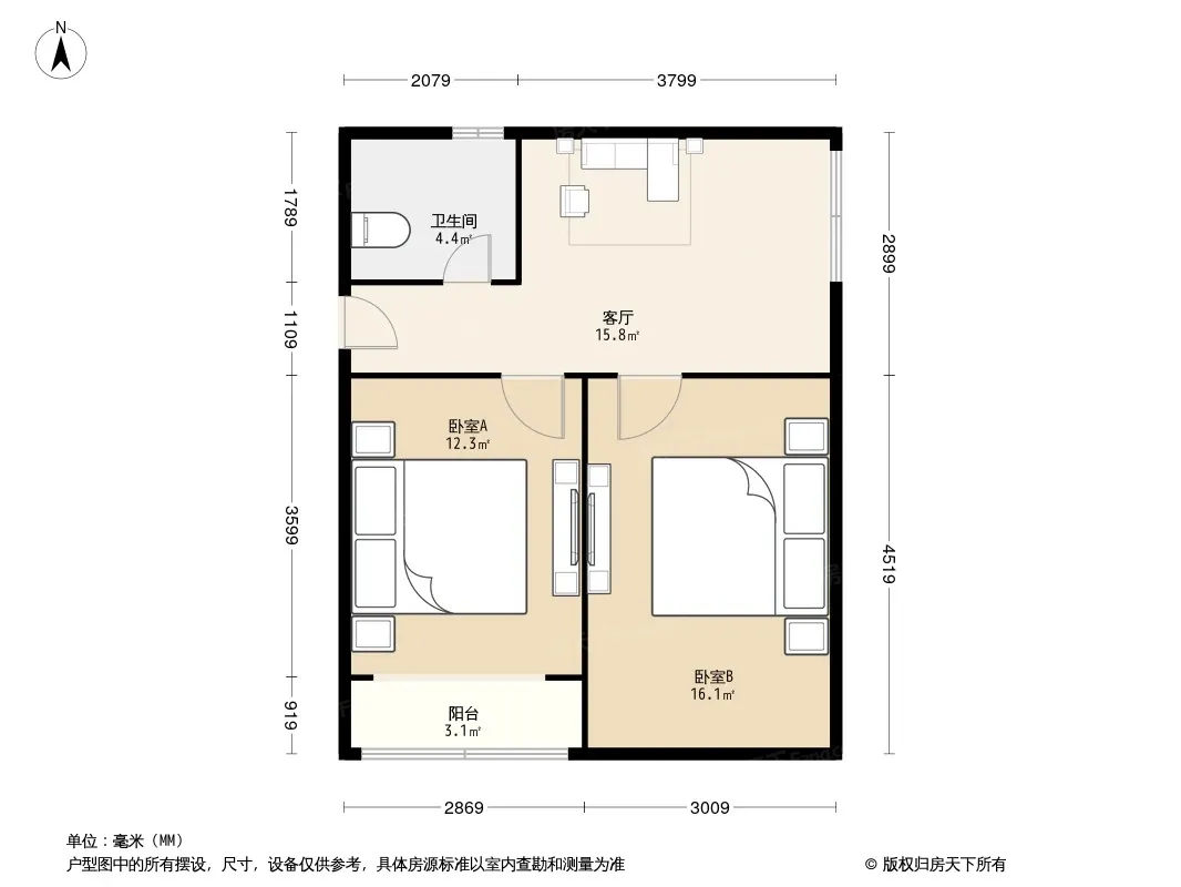 户型齐全,主打户型方正,明卫,明厨,客厅朝南,主卧朝南二居