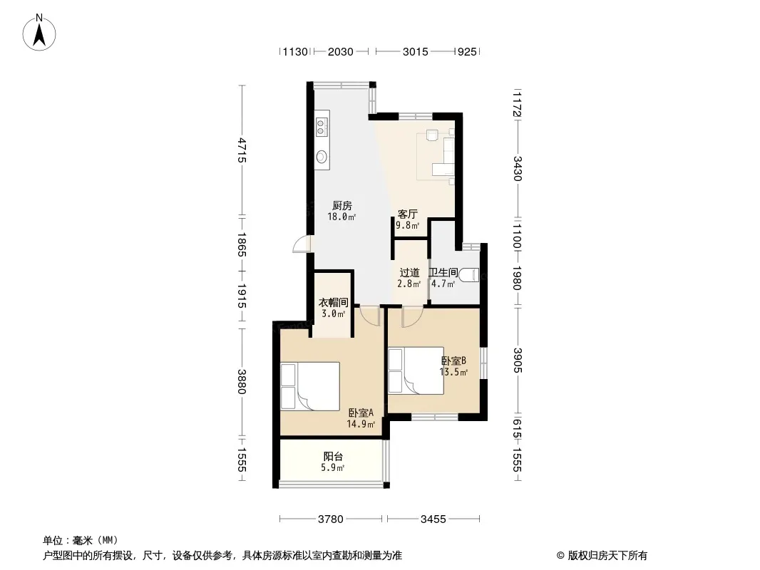 户型齐全,主打户型方正,明厨,明卫,独立衣帽间,客厅朝南二居